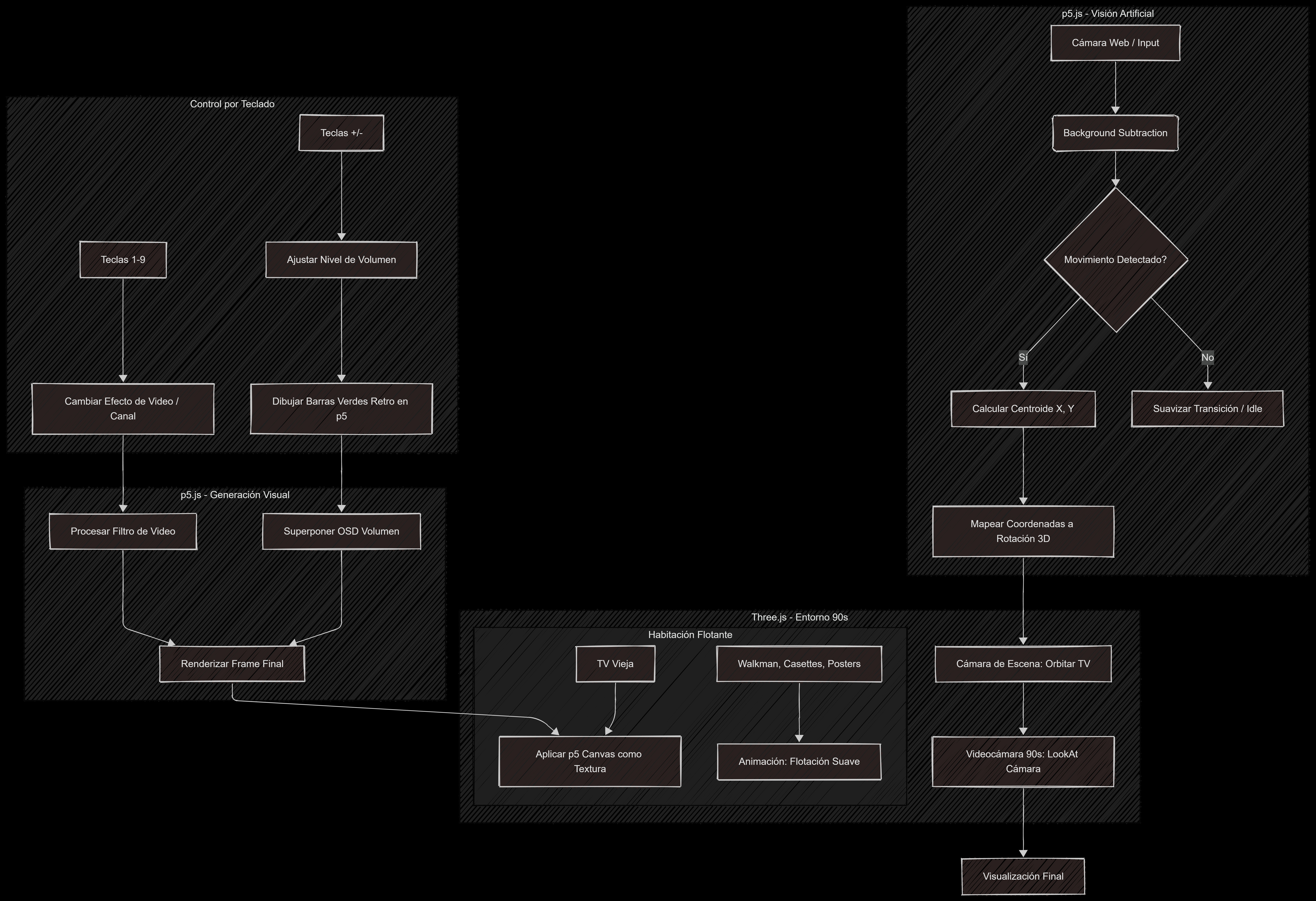 prevFrame y el actual.three_scene.js — El Entorno de Renderizado 3DSe comunica con el Canvas 2D de p5.js y lo mapea como un material fotoluminiscente (mapa Emisivo) en el modelo GLTF del televisor antiguo.